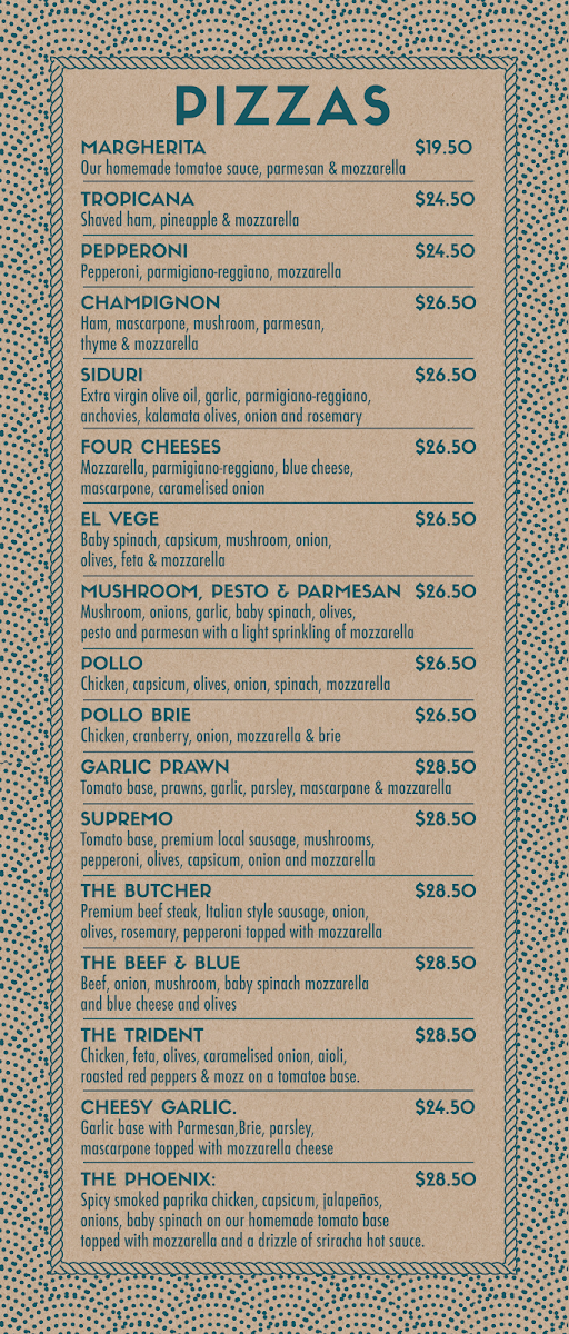 Tomato base, premium local sausage, mushrooms, pepperoni, olives, capsicum, onion and mozzarella.